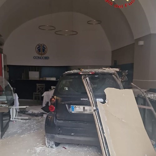 Attimi di paura questo pomeriggio a Salerno, nel quartiere Fuorni, dove un'auto ha fatto irruzione all'interno del ristorante "Compagnia del Concord". Per cause ancora da chiarire, ma che potrebbero essere legate a motivi personali, un uomo alla guida di una Smart ha sfondato la parete d'ingresso del locale, terminando la sua corsa direttamente nella sala principale.