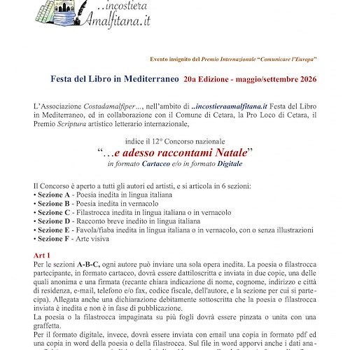 È ufficialmente partita la nuova edizione del Concorso nazionale "...e adesso raccontami Natale", giunto quest'anno alla sua XII edizione e inserito nell'ambito della Festa del Libro in Mediterraneo organizzata dall'Associazione Costadamalfiper... in collaborazione con il Comune di Cetara, la Pro Loco e il Premio Scriptura.