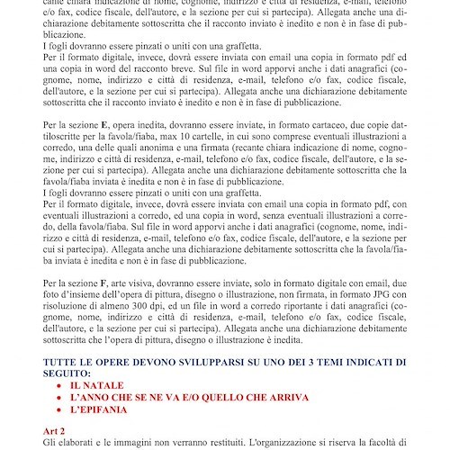 Il concorso, aperto ad autori e artisti di tutta Italia, propone sei sezioni: poesia in lingua italiana, poesia in vernacolo, filastrocca, racconto breve, favola/fiaba e arte visiva. Tutti i lavori dovranno svilupparsi intorno a uno dei tre temi centrali: Natale, l'anno che se ne va e/o quello che arriva, l'Epifania.