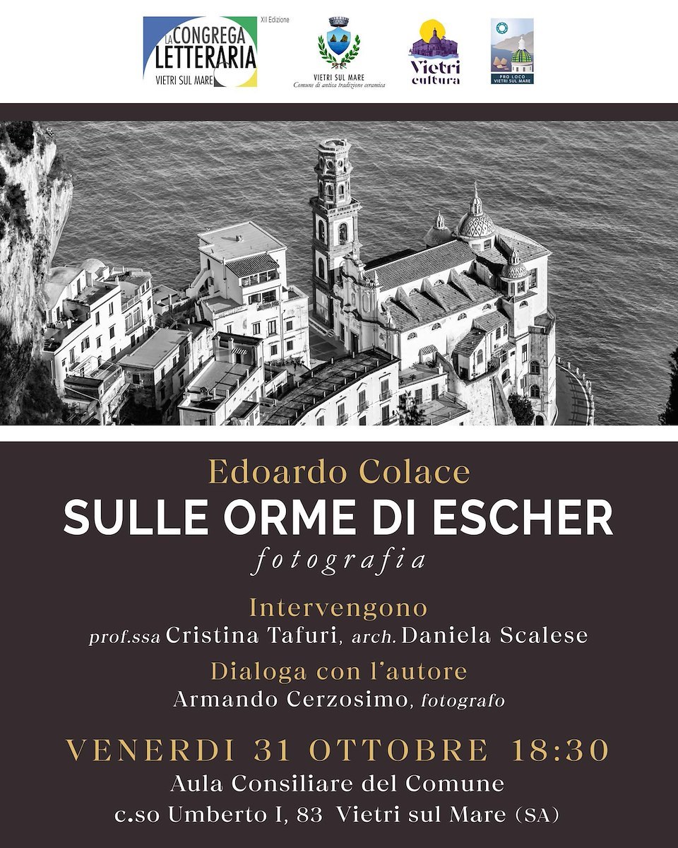 Venerdì 31 ottobre, alle ore 18.30, presso l'Aula Consiliare del Comune (corso Umberto I n.83), il fotografo salernitano Edoardo Colace presenterà "Sulle orme di Escher - Fotografia", un progetto che rilegge con sguardo contemporaneo i luoghi che ispirarono il grande artista olandese Maurits Cornelis Escher.