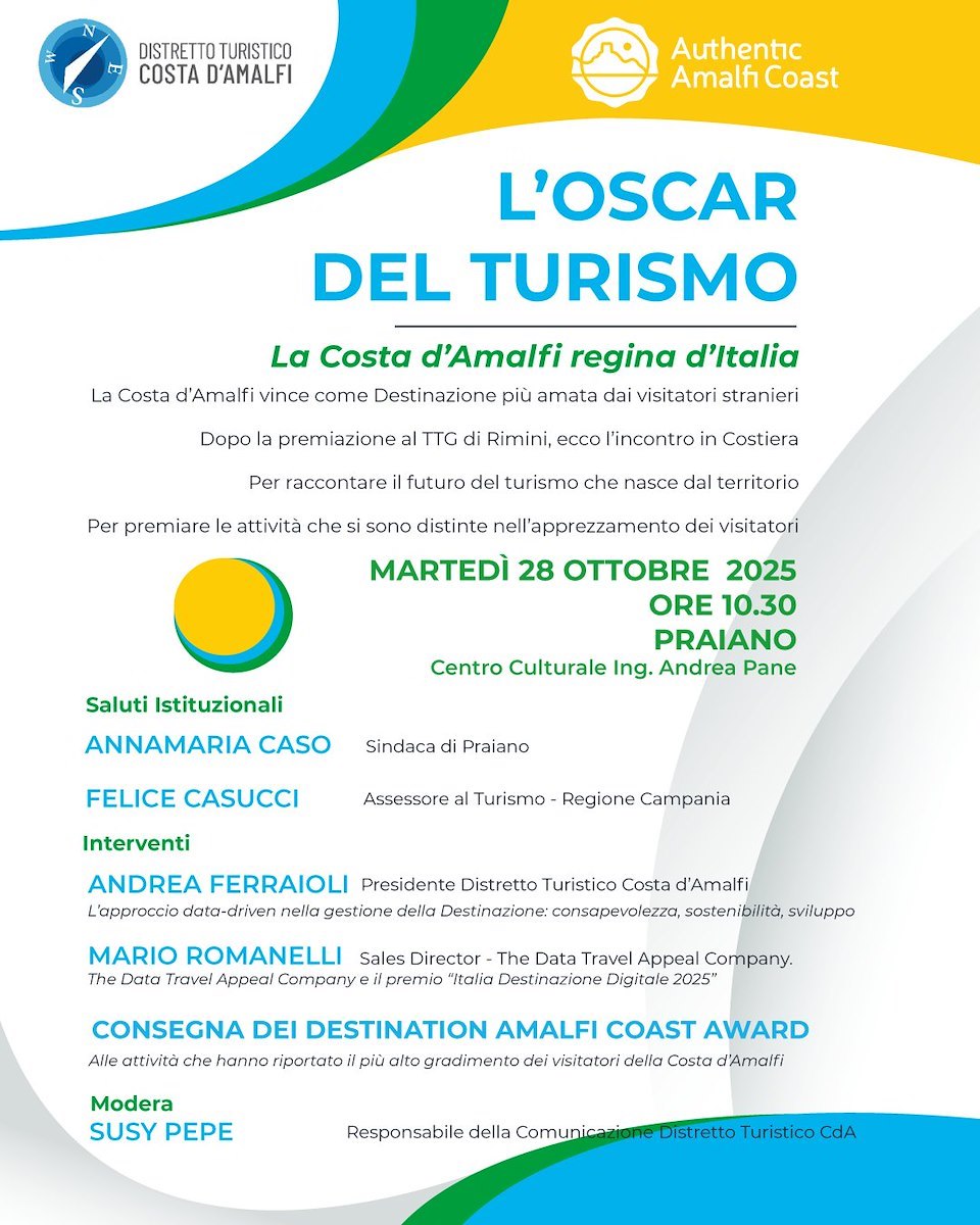 L'evento, promosso dal Distretto Turistico Costa d'Amalfi, rappresenta un'occasione per raccontare i risultati che hanno portato al prestigioso riconoscimento e per presentare i dati della stagione turistica 2025, contraddistinta da un incremento dell'attrattività internazionale e da un approccio sempre più sostenibile e digitale alla gestione della destinazione.