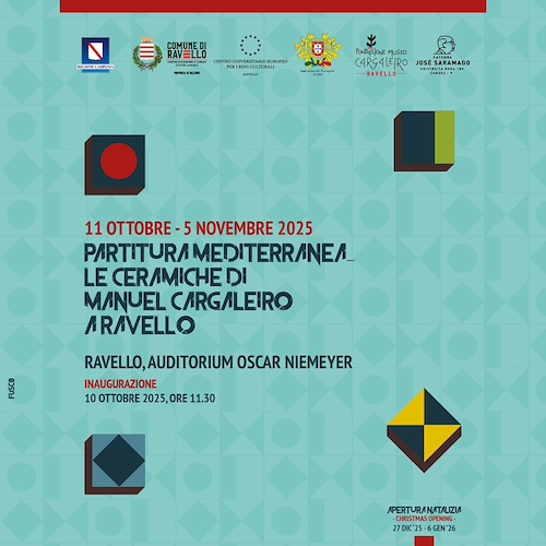 Venerdì 10 ottobre, alle ore 11,30, sarà inaugurata presso l'Auditorium Oscar Niemeyer di Ravello la mostra dal titolo "Partitura Mediterranea. Le ceramiche di Manuel Cargaleiro a Ravello", dedicata all'artista considerato tra i importanti ceramisti e pittori portoghesi del XX secolo. Promossa dal Comune di Ravello, in collaborazione con il Centro Universitario Europeo per i Beni Culturali e la Fondazione Museo Manuel Cargaleiro Ravello, la mostra è finanziata dalla Regione Campania e patrocinata dall'Ambasciata del Portogallo in Italia e dalla Catedra José Saramago dell'Università Roma Tre. L'esposizione propone una selezione delle opere ceramiche che il maestro portoghese, scomparso lo scorso anno, realizzò tra la fine degli anni Novanta i primi decenni del nuovo secolo. Un periodo in cui Cargaleiro frequentò assiduamente la costiera amalfitana e, in particolare, Ravello e Vietri sul Mare. All'incontro interverranno Paolo Vuilleumier, sindaco di Ravello, João Camilo Costa; consigliere d'Ambasciata del Portogallo in Italia; Alfonso Andria, presidente del Centro Universitario Europeo per i Beni Culturali; Giorgio De Marchis, della Cattedra José Saramago Università Roma Tre; e Vincenzo Biffi Gentili, storico e critico d'arte e delle arti applicate, moderati dallo storico dell'arte Pasquale Ruocco. Il percorso si articola tra l'auditorium Niemeyer e Palazzo Tolla, sede del Comune di Ravello, a cui si aggiungono i grandi pannelli realizzati per la piazzetta di San Cosma e l'istituto scolastico di Via Roma.La mostra resterà aperta dall'11 ottobre al 2 novembre e dal 27 dicembre al 6 gennaio 2026 nei seguenti orari: Auditorium Oscar Niemeyer, tutti i giorni dalle ore 10 alle 13 e dalle 14 alle 17, Palazzo Tolla, lunedì e mercoledì dalle ore 10 alle 13 e dalle 16 alle 18, martedì, giovedì e venerdì dalle ore 10 alle 13, mentre sabato e domenica dalle ore 10 alle 13 e dalle 14 alle 17.
