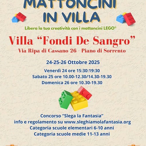 La fantasia torna protagonista a Villa Fondi con l'attesissimo appuntamento "Mattoncini in Villa", in programma dal 24 al 26 ottobre 2025, a Piano di Sorrento (Napoli). Tre giorni dedicati all'immaginazione, al gioco e alla creatività con i celebri mattoncini LEGO®️, in un evento promosso dal Comune di Piano di Sorrento - Politiche Giovanili, in collaborazione con Sleghiamo la Fantasia e il Museo del Mattoncino (MDM).