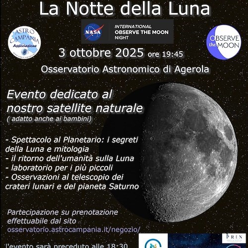 Venerdì 3 ottobre 2025 l'Osservatorio Astronomico Salvatore Di Giacomo, ad Agerola, ospiterà la Notte della Luna, evento su prenotazione promosso dall'Associazione AstroCampania nell'ambito della rassegna internazionale International Observe the Moon Night (IOMN), che ogni anno coinvolge migliaia di osservatori in tutto il mondo.