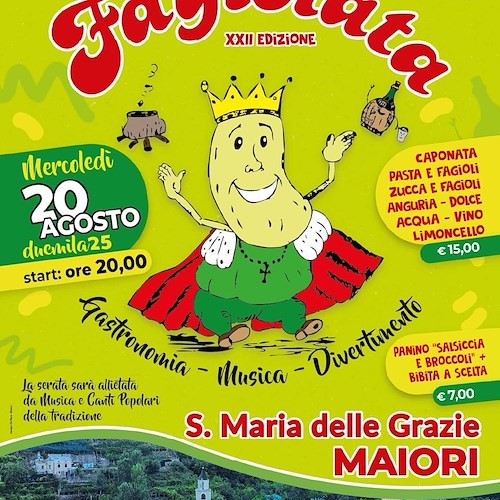 MAIORI - Dopo il successo delle passate edizioni, torna nella ridente borgata di Santa Maria delle Grazie uno degli eventi più amati dell'estate maiorese: la Fagiolata, giunta alla sua XXII edizione. L'appuntamento è fissato per la serata di oggi, mercoledì 20 agosto, con inizio alle ore 20.