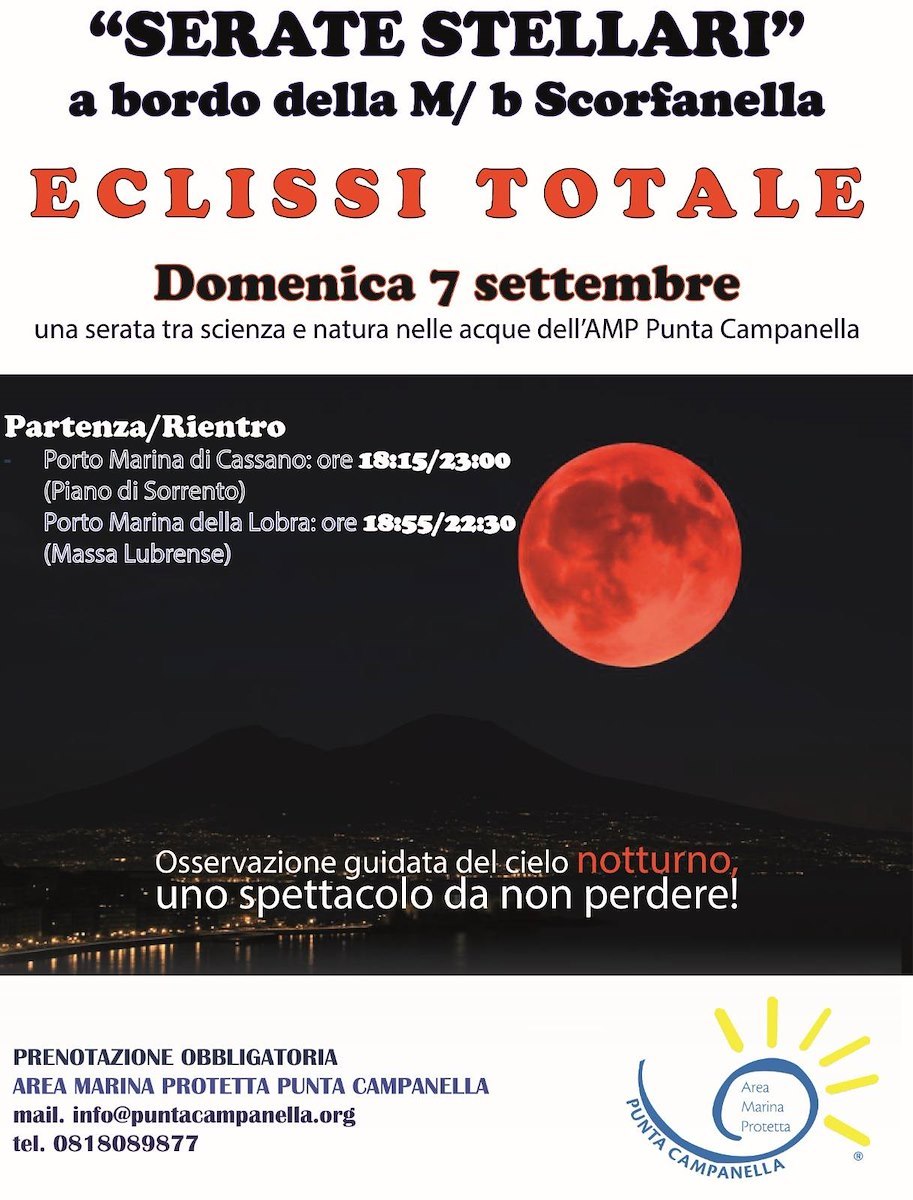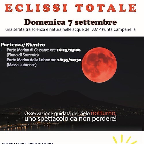 Domenica 7 settembre 2025 l'Area Marina Protetta Punta Campanella propone un appuntamento speciale con le "Serate Stellari": l'osservazione dal mare dell'eclissi totale di Luna. A bordo della motonave Scorfanella, i partecipanti vivranno un'esperienza suggestiva tra natura e scienza, con la guida del professor Antonio Russo che accompagnerà il pubblico alla scoperta dei segreti del fenomeno astronomico.