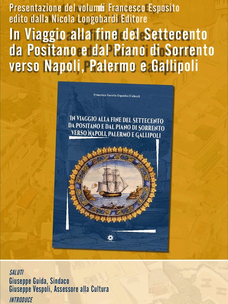 Un tuffo nella memoria storica della Costiera Amalfitana, quando il mare non era soltanto confine ma via privilegiata di comunicazione e sviluppo. È questo il cuore della presentazione del volume di Francesco Saverio Esposito, "In Viaggio alla fine del Settecento da Positano e dal Piano di Sorrento verso Napoli, Palermo e Gallipoli", in programma venerdì 10 ottobre alle ore 17:30 presso l'Ufficio del Turismo "Luca Vespoli" di Positano.
