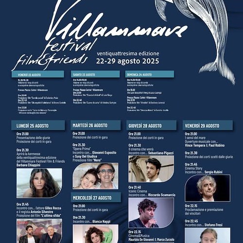 Torna il cinema in riva al mare ricco di ospiti e proiezioni con il Villammare Festival Film&Friends, giunto alla XXIV edizione, manifestazione organizzata da Alessandro Cocorullo, con il supporto di Andrea Axel Nobile Dal 22 al 24 agosto si susseguiranno le proiezioni no stop; il pomeriggio a partire dalle ore 14 cortometraggi e anteprime presso l'Hotel Le Piane, la sera a partire dalle ore 20 i lungometraggi in concorso nella piazzetta Cattel. Il 23 Marcia della Pace in collaborazione con il Comune di Vibonati, una fiaccolata da C. da Oliveto a Piazza Cattel dove, a seguire, alle 20.30 verrà proiettato il pluripremiato docufilm "No Other land".
