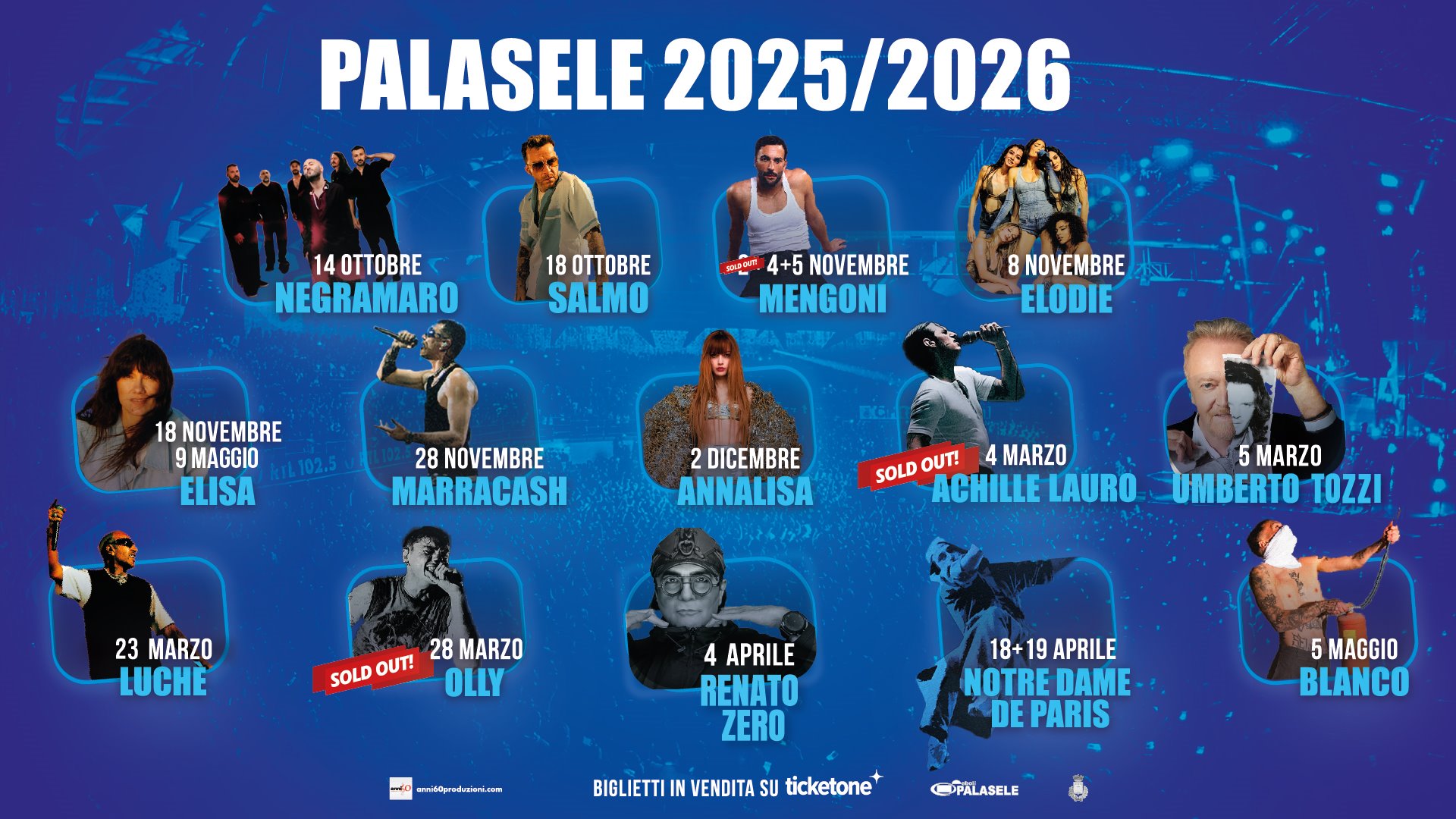 IL CALENDARIO DEL PALASELE 2025/2026 Continua intanto ad arricchirsi il calendario degli show nel programma a cura di Anni 60 produzioni al PalaSele di Eboli. Salgono a 15 gli spettacoli attesi da ottobre a maggio per una stagione tutta da vivere sottopalco. Dopo il ritorno martedì 15 dei negramaro, i riflettori del PalaSele si riaccenderanno sabato 18 ottobre sul "Salmo World Tour 2025". Con il suo primo tour mondiale Salmo si ferma a Eboli per portare dal vivo tutta la carica di un disco nato per stare sul palco, il nuovo album RANCH, oltre al meglio del suo repertorio. A seguire, la tripletta di Marco Mengoni che con la leg italiana del tour "Live in Europe 2025" si esibirà domenica 2, martedì 4 e mercoledì 5 novembre. Già sold out la prima data, continua la caccia al biglietto per gli altri due appuntamenti. Sabato 8 novembre la scena sarà tutta per Elodie che arriva per la prima volta al PalaSele con il tour "Elodie Show 2025", estensione naturale del grande show portato quest'estate negli stadi. Attesissima da tempo, martedì 18 novembre fa tappa a Eboli "Elisa Palasport Live 2025", il tour che segna il ritorno di Elisa nei palazzetti a sette anni di distanza dall'ultima volta e che per la grande richiesta continuerà anche nella primavera del 2026 quando l'artista ha già annunciato una nuova data a Eboli per sabato 9 maggio. Partirà proprio dal PalaSele, venerdì 28 novembre, il tour "MarraPalazzi25", lo show di Marracash che ha già conquistato gli stadi e che si appresta a espugnare i principali palazzetti italiani. Sarà la prima volta che il "King del Rap", per citare uno dei suoi album di successo, si esibirà a Eboli, come sarà la prima volta anche per Annalisa che con il "CAPITOLO I" della sua nuova narrazione salirà sul palco del PalaSele martedì 2 dicembre.