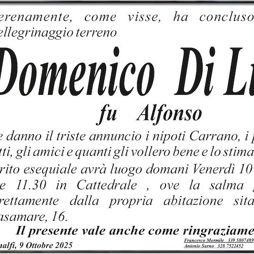 Ne danno il triste annuncio i nipoti Carrano, i pronipoti, gli amici e quanti gli vollero bene e lo stimarono. Il rito esequiale si terrà domani, venerdì 10 ottobre, alle ore 11.30 nella Cattedrale di Amalfi, dove la salma giungerà direttamente dalla propria abitazione in via Casamare, 16.