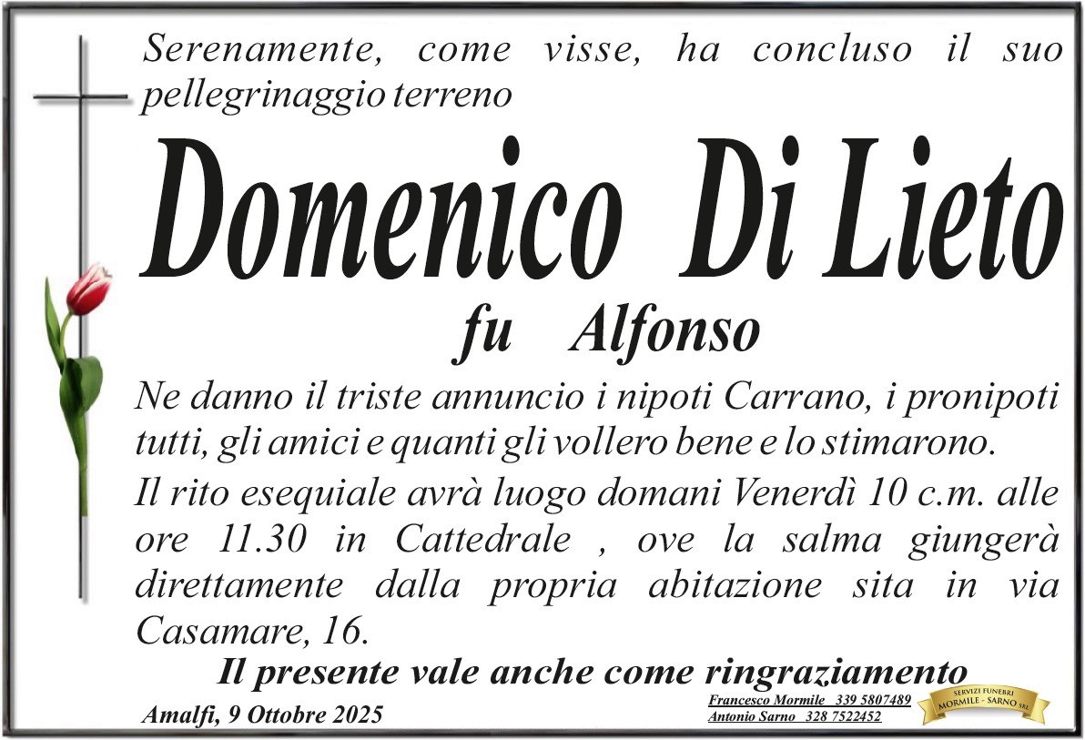 Amalfi si stringe nel dolore per la scomparsa di Domenico Di Lieto, 91 anni, nato e residente nella città. Serenamente, come visse, ha concluso il suo pellegrinaggio terreno circondato dall'affetto dei suoi cari.