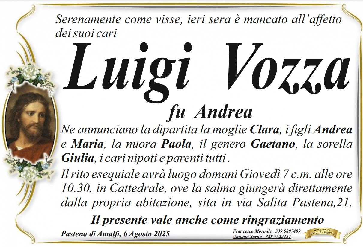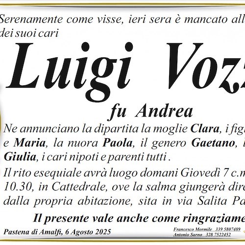 Serenamente, come visse, Luigi Vozza si è spento ieri sera nella sua casa di Pastena di Amalfi, lasciando un profondo vuoto tra i suoi cari e nella comunità che lo ha sempre stimato.