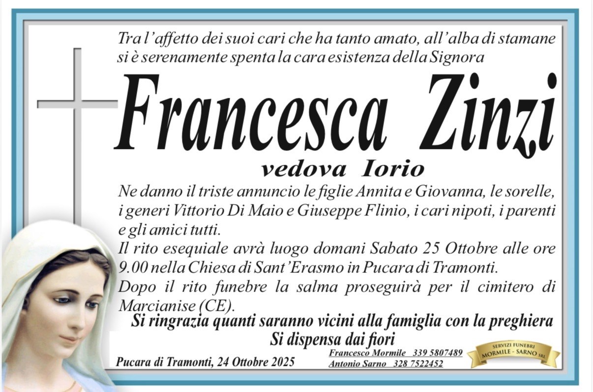 Nata a Marcianise, la Signora Zinzi ha vissuto per molti anni ad Amalfi e, negli ultimi tempi, a Tramonti. La famiglia ringrazia quanti vorranno unirsi in preghiera e si dispensa dai fiori.