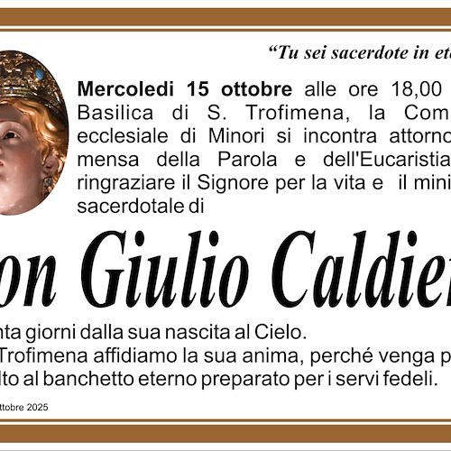 Mercoledì 15 ottobre, alle ore 18:00, la comunità ecclesiale di Minori si riunirà nella Basilica di Santa Trofimena per una celebrazione speciale in ricordo di don Giulio Caldiero, a un mese dalla sua morte. Un incontro di preghiera, che avrà al centro la mensa della Parola e dell'Eucaristia, per rendere grazie al Signore per la vita e il ministero sacerdotale di questo amato sacerdote, scomparso all'età di 82 anni.