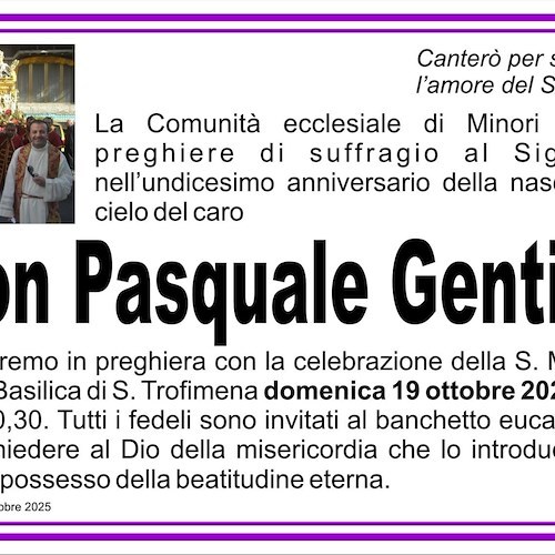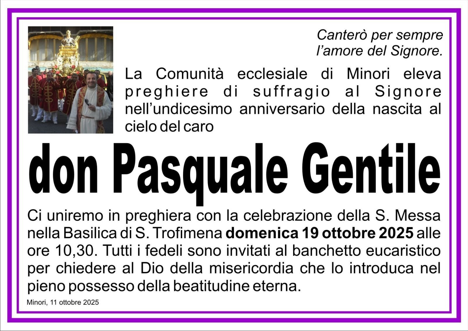 Domenica 19 ottobre 2025 la comunità di Minori si riunirà in preghiera per ricordare don Pasquale Gentile, figura amatissima della diocesi di Amalfi-Cava de' Tirreni, in occasione dell'undicesimo anniversario della sua nascita al cielo.
