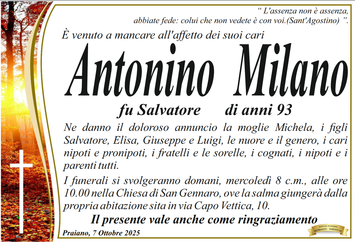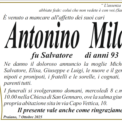 I funerali si terranno domani, mercoledì 8 ottobre, alle ore 10.00, nella Chiesa di San Gennaro a Praiano, partendo dall'abitazione sita in via Capo Vettica, 10.