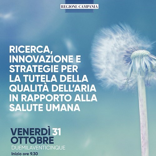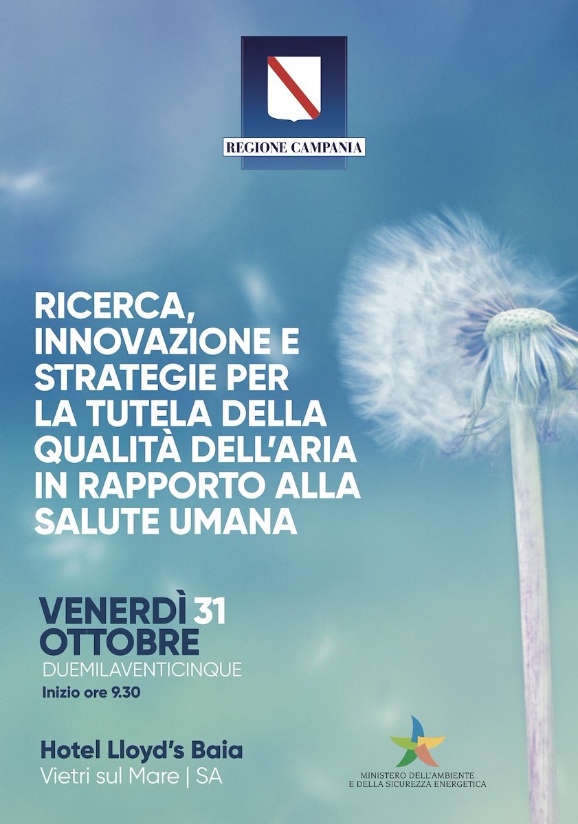 Si terrà venerdì 31 ottobre 2025 presso l'Hotel Lloyd's Baia di Vietri sul Mare il convegno dal titolo "Ricerca, Innovazione e Strategie per la Tutela della Qualità dell'Aria in rapporto alla salute umana", evento conclusivo e di presentazione dei risultati delle attività svolte nell'ambito dell'Accordo di Programma Quadro sottoscritto tra la Regione Campania e il Ministero dell'Ambiente e della Sicurezza Energetica (MASE) l'11 febbraio 2021.