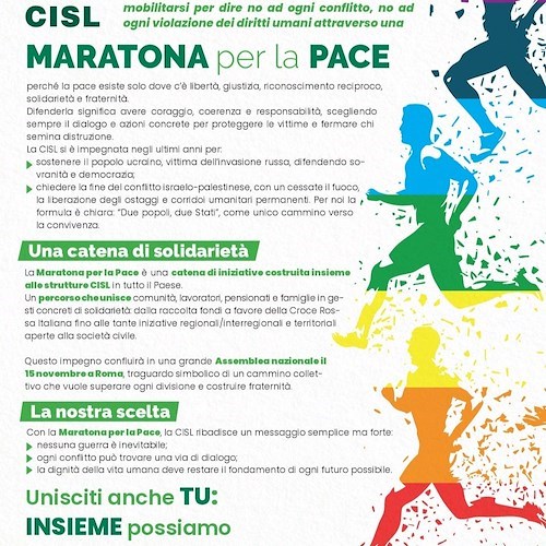 La CISL scende in campo per la pace con un'iniziativa che unisce simbolicamente tutto il Paese: la "Maratona per la Pace", una lunga catena di eventi, incontri e gesti di solidarietà promossi dalle strutture territoriali e regionali della confederazione.
