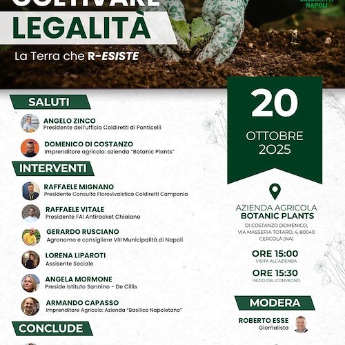 Le realtà agricole ad est di Napoli sono le protagoniste dell'incontro "Coltivare Legalità" organizzato da Coldiretti Napoli lunedì 20 ottobre 2025 alle ore 15 nell'Azienda Agricola Botanic Plants in Via Masseria Totaro n.4 a Cercola.
