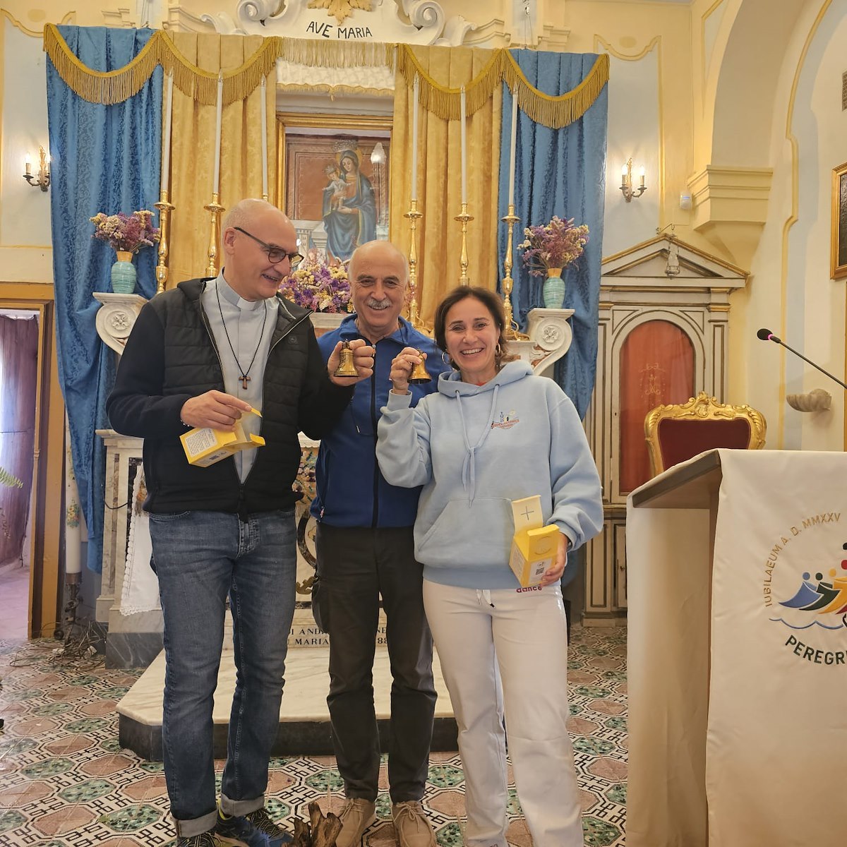 Al termine della celebrazione, il Responsabile del Santuario ha voluto ringraziare Padre Robert e Stefania Novi donando loro una riproduzione in miniatura della Campana del Giubileo della Speranza 2025, realizzata dalla Pontificia Fonderia Marinelli di Agnone (Isernia). A tutti i componenti del coro è stato consegnato un portachiavi commemorativo, con da un lato il simbolo del Giubileo e dall'altro l'immagine della Madonna del Bando, segno tangibile di un incontro che resterà impresso nel cuore di ciascuno.