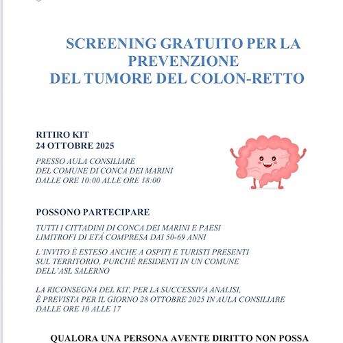 La tutela della salute pubblica passa anche attraverso la prevenzione. Con questo obiettivo l'Amministrazione Comunale di Conca dei Marini, attraverso l'Assessorato alla Salute e ai Servizi Sociali, organizza lo screening gratuito per la prevenzione del tumore del colon-retto, in collaborazione con l'ASL Salerno.