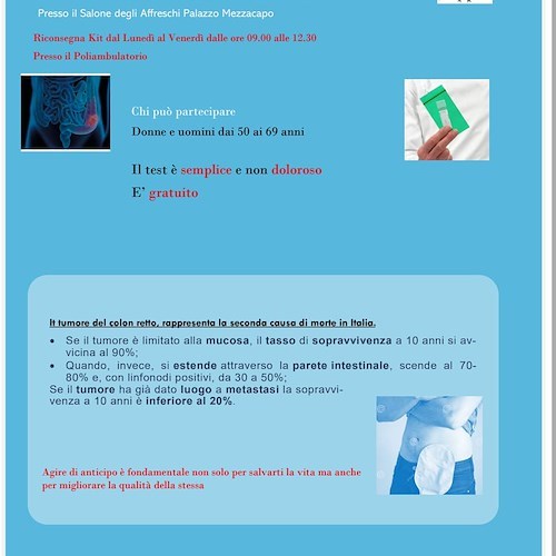 L'amministrazione guidata dal Sindaco Antonio Capone ha deciso di supportare questa nuova attività di prevenzione ospitando la giornata dedicata allo screening gratuito del tumore del colon retto, che si terrà domenica 26 ottobre, dalle ore 10.00 alle ore 13.00, presso il Salone degli Affreschi di Palazzo Mezzacapo, dove sarà possibile ritirare in maniera del tutto gratuita il kit per il test da fare con tranquillità a casa. Il test è semplice, non invasivo, un piccolo gesto che può fare una grande differenza.