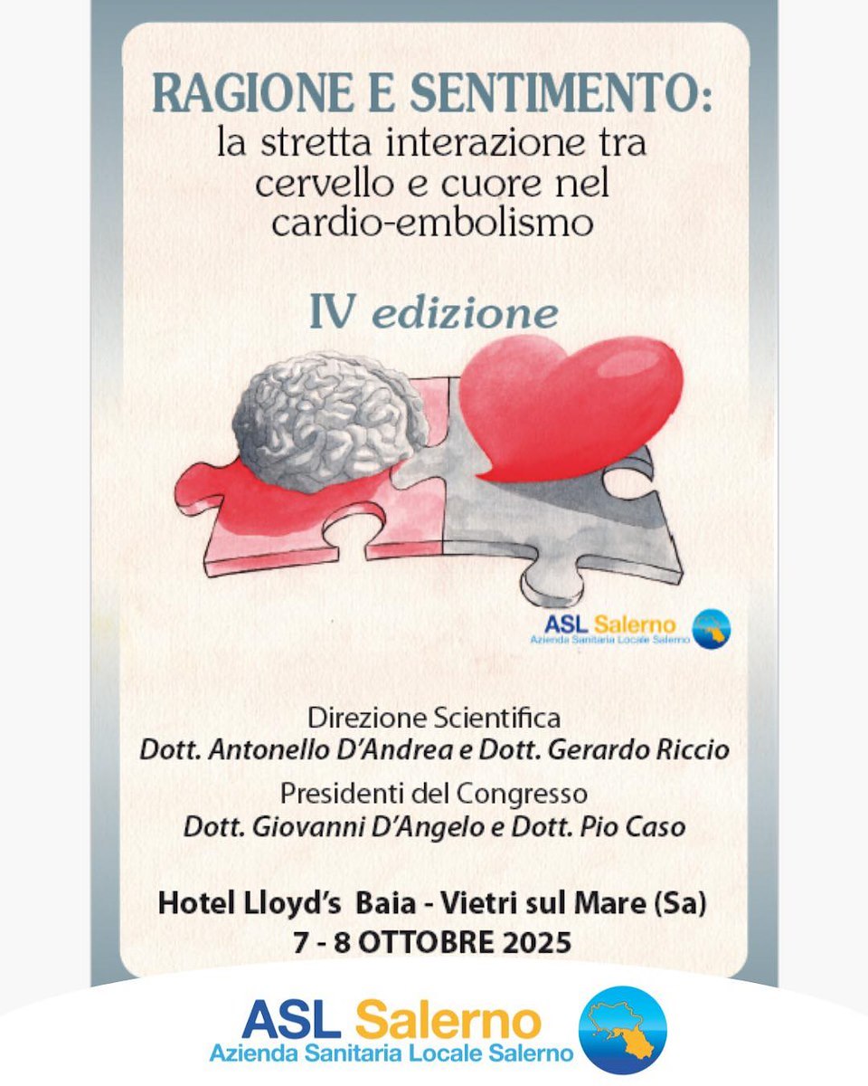 Si terrà i giorni 7 e 8 ottobre, all'Hotel Lloyd's Baia di Vietri sul Mare (SA), il congresso "Ragione e Sentimento: la stretta interazione tra cervello e cuore nel cardio-simbolismo".
