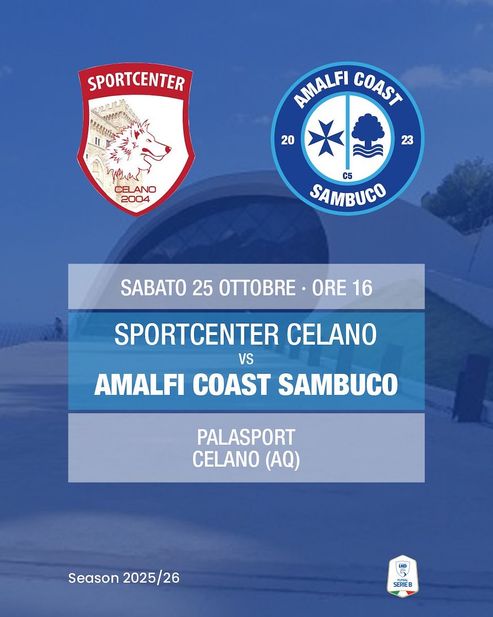 Dopo un avvio di stagione entusiasmante, l’Amalfi Coast Sambuco si prepara al suo terzo impegno nel campionato di Serie B. Sabato 25 ottobre, alle ore 16, gli uomini di Mister Ruocco e Mister Gambardella saranno di scena al Palasport di Celano (AQ), dove affronteranno lo Sport Center Celano in una sfida fondamentale per il prosieguo della stagione. Anche lo Sport Center allenato da Mister Leonardo Contestabile ha conquistato il palcoscenico nazionale lo scorso anno e ha tutta l’intenzione di fare bene nella categoria. Pari punti in classifica per i biancoblù e i biancorossi entrambi appaiati a 3 punti frutto, per il team del Presidente De Luise, del buon esordio contro il Velletri e della prima storica vittoria casalinga di Tramonti contro il Superaequum. Due prove che hanno messo in luce spirito di gruppo, crescita tecnica e la voglia di misurarsi con una categoria importante come la Serie B.