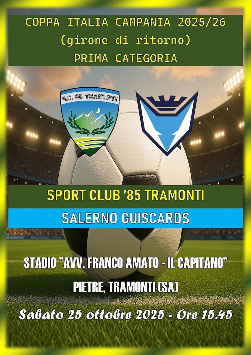 Il campionato di Prima Categoria si ferma per lasciare spazio alla Coppa Italia Campania 2025/26, ma in casa Sport Club '85 Tramonti l'attesa è tutt'altro che di riposo. I gialloverdi di mister Baino tornano in campo sabato 25 ottobre per il girone di ritorno contro il Salerno Guiscards, in una sfida che profuma di rivincita e di orgoglio.