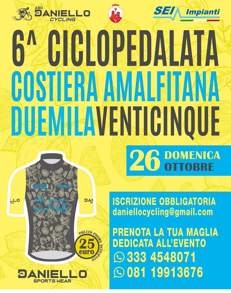 Domenica 26 ottobre la Costiera Amalfitana sarà teatro di una grande ciclopedalata, un evento dedicato agli amanti della bicicletta, dai dilettanti ai professionisti, per ammirare i panorami mozzafiato della costa e condividere la passione per lo sport su due ruote.