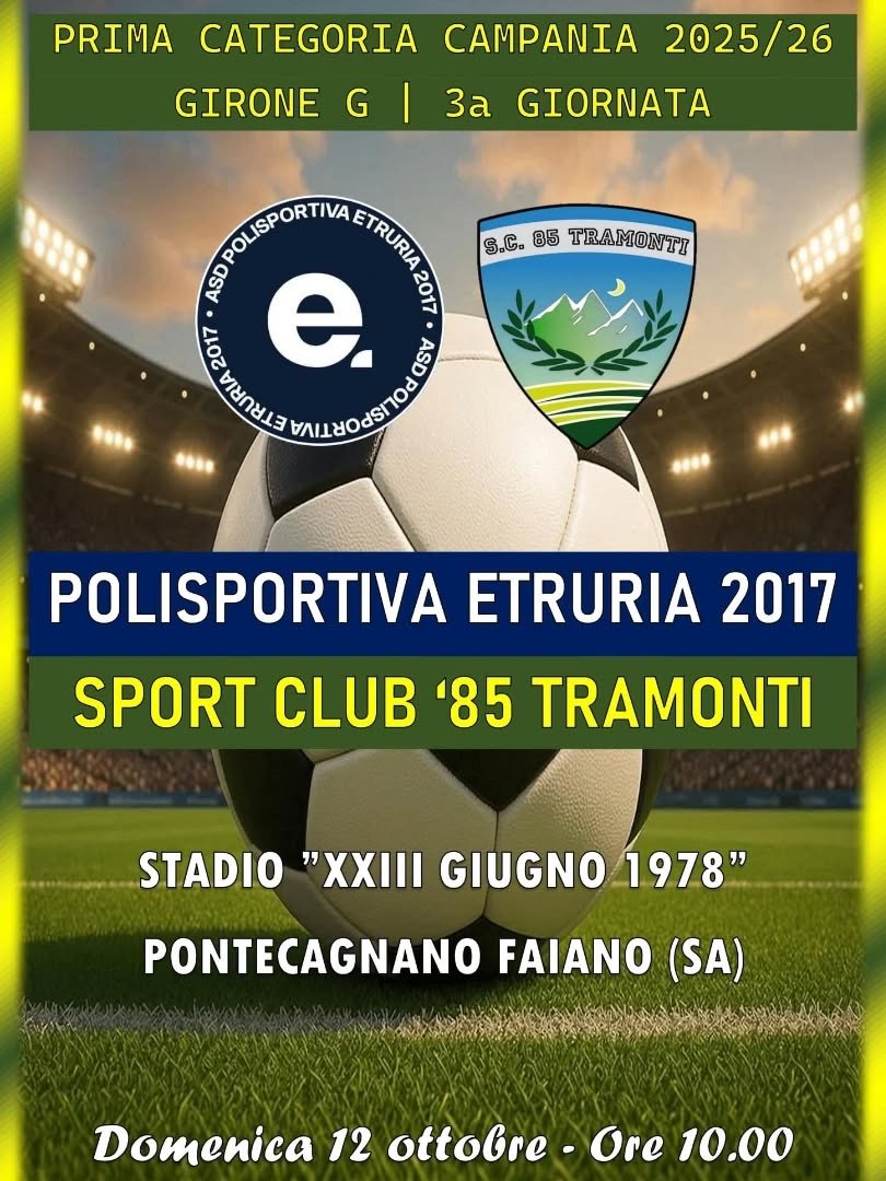 Prosegue il cammino dello Sport Club '85 Tramonti nel campionato di Prima Categoria Campania - girone G. I gialloverdi di Mister Baino, dopo le due importanti vittorie nelle prime giornate, si preparano ad affrontare una nuova sfida in trasferta: domenica 12 ottobre 2025, allo stadio "XXIII Giugno 1978" di Pontecagnano Faiano (SA), affronteranno la Polisportiva Etruria 2017, formazione neopromossa e desiderosa di mettere in difficoltà gli avversari.