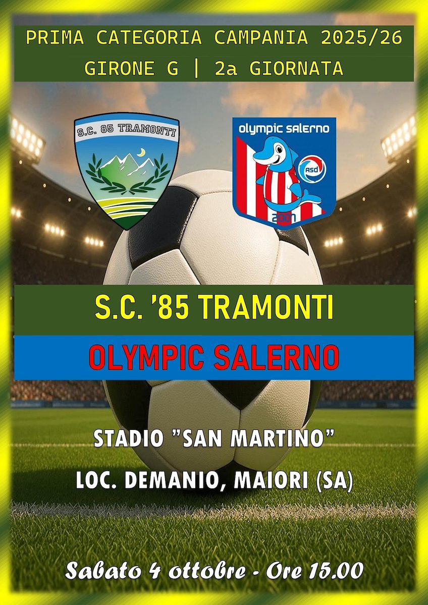 Dopo la vittoria conquistata nella prima giornata di campionato contro il Lavorate Calcio, lo Sport Club '85 Tramonti si prepara al debutto casalingo. Sabato 4 ottobre 2025, con fischio d'inizio alle ore 15, i gialloverdi allenati da Mimmo Baino ospiteranno allo Stadio "San Martino" di Maiori (loc. Demanio) l'Olympic Salerno.