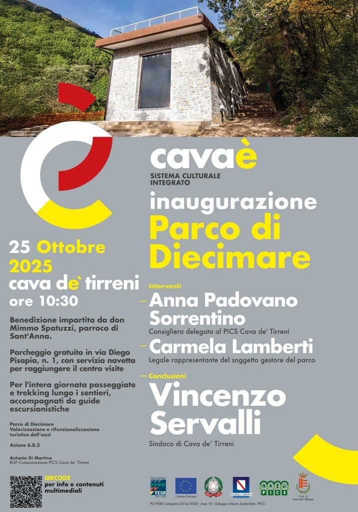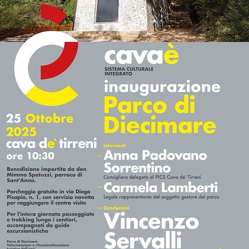 Sarà inaugurata sabato prossimo 25 ottobre, alle ore 10.30, l'Oasi Naturalistica del Parco Diecimare alla frazione S. Anna, a Cava de' Tirreni, finanziato con 883 mila euro dei Fondi P.I.C.S. PO FESR 2014/2020 Asse 10 Azione 6.8.3..
