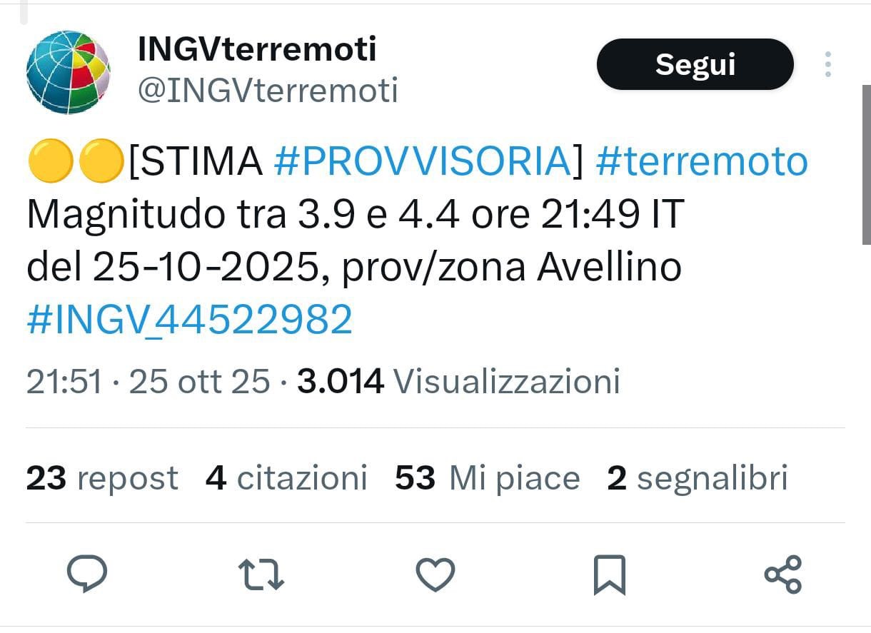 Dopo la scossa di ieri pomeriggio, alle ore 14:40 circa, un'altra evento di magnitudo stimato tra 3.9 e 4.4 ha colpito la provincia di Avellino, nella regione dell'Irpinia, secondo i dati preliminari del Istituto Nazionale di Geofisica e Vulcanologia (INGV).